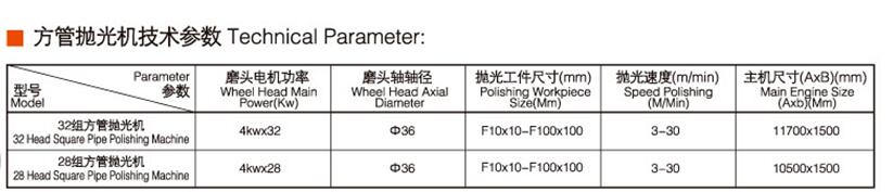 方拋光機(jī)管適用于正方形和矩形截面的各種金屬外表面的拋光。整機(jī)由拋光主機(jī)、給料裝置、出料裝置和控制系統(tǒng)四部份組成。方管拋光機(jī)根據(jù)拋管范圍和配置不同可分為基本型拋光機(jī)和高配型方管拋光機(jī)。根據(jù)拋光頭的數(shù)量不同又分為28頭、32頭、36頭方拋光機(jī)。經(jīng)該機(jī)拋磨后,表面粗糙度可達(dá)500#-700#。